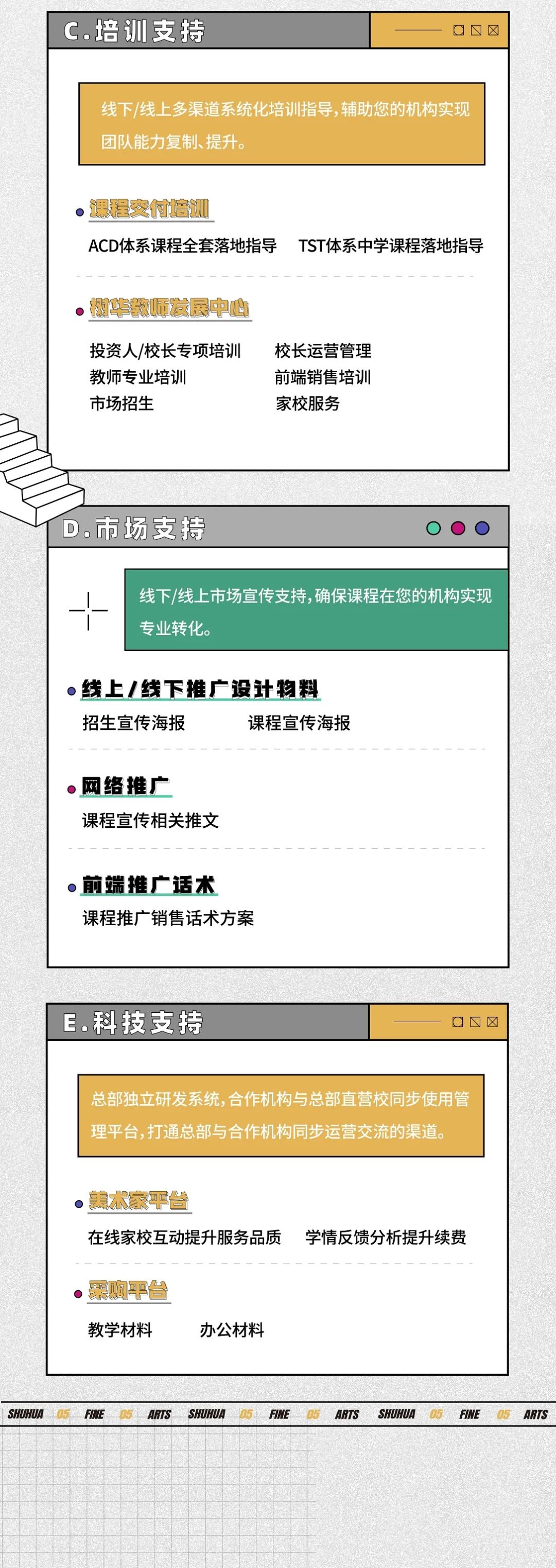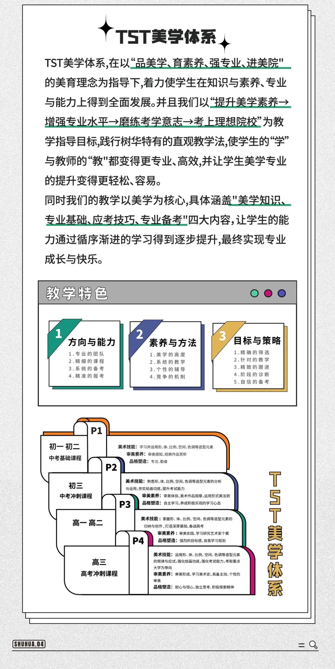 ? ? 樹華美術(shù)創(chuàng)辦20多年來,秉承 “藝術(shù)引路人”的教育理念,致力于為廣大客戶提供美學(xué)鑒賞、文化創(chuàng)意、興趣素養(yǎng)、專業(yè)造型、美術(shù)備考等一站式服務(wù)。目前樹華美術(shù)已形成了成熟的美術(shù)教育生態(tài)體系,產(chǎn)品涵蓋少兒美術(shù)、中學(xué)美術(shù)、高考美術(shù)、大學(xué)與成人美術(shù)、國際藝術(shù)留學(xué)、在線美術(shù)、藝術(shù)研學(xué)等領(lǐng)域。